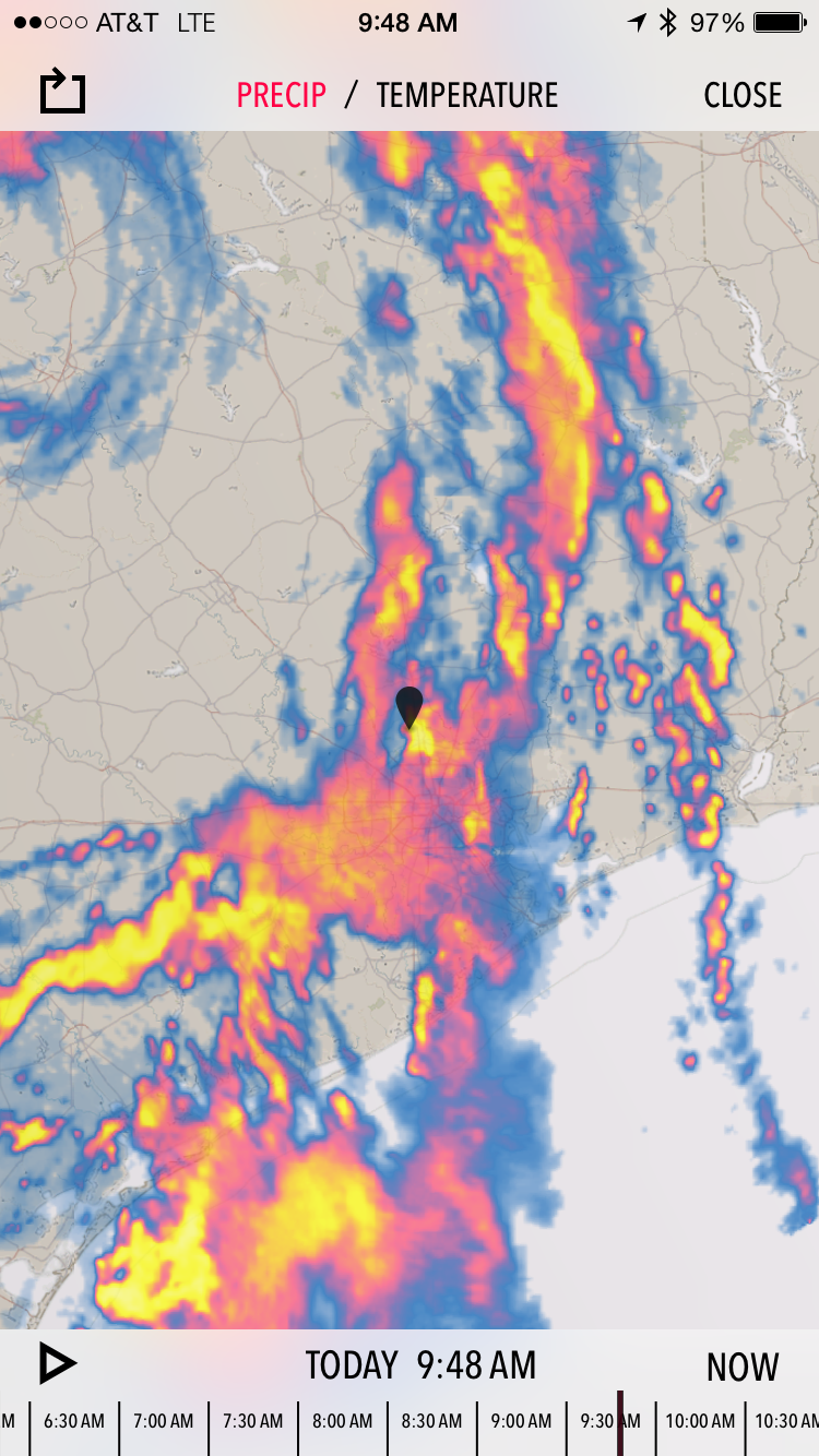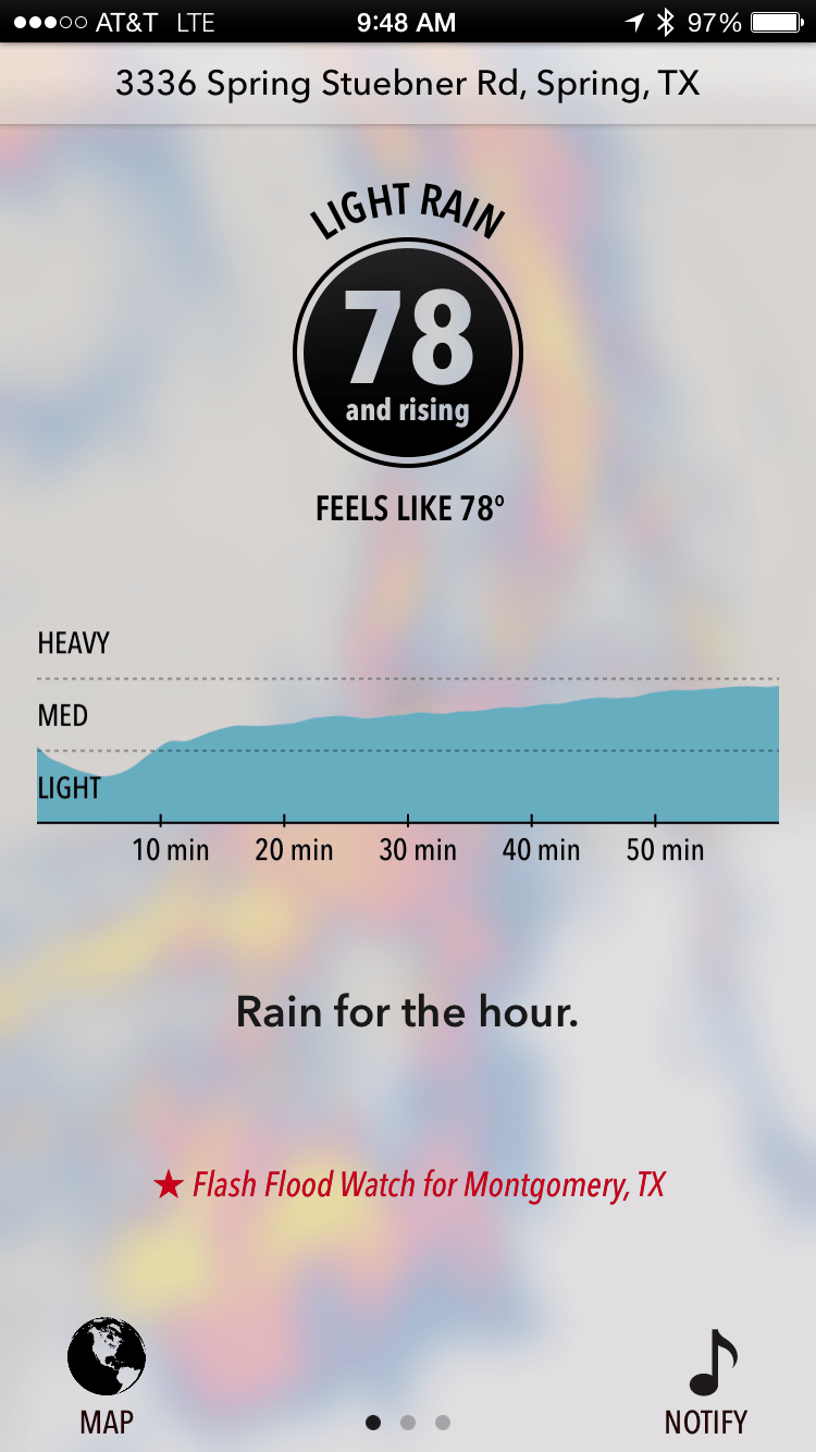 You also get an (hour ahead look) at the potential rainfall for your geo-located area- plus National Weather Service weather alerts for your location.